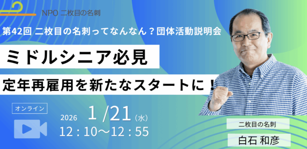 大企業でのキャリアを経て「NPO法人二枚目の名刺」に関わり続ける登壇者が、自身の実体験をもとに、定年前後に訪れる環境変化や心の揺らぎとどう向き合い、次の人生をデザインしてきたのかを語ります。
