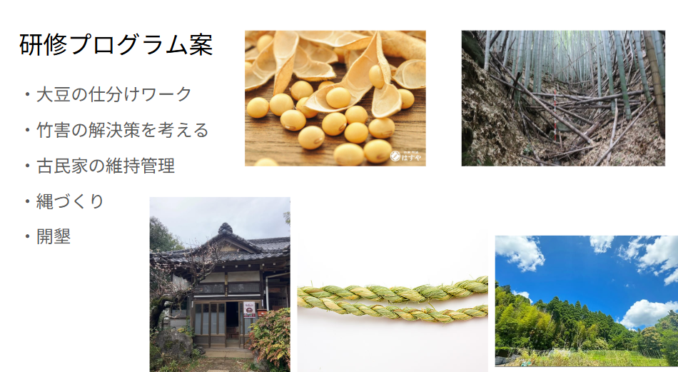 企画案としては、①大豆の仕分けワーク②竹害の解決策を考える③古民家の維持管理④縄づくり⑤開墾といった5個の案を考えました。