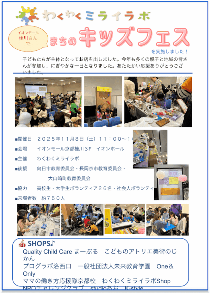 中間報告会以降、社会人メンバーはわくミラの夏祭りに続き、11月8日に開催された「キッズフェス」でも活躍しました。イオンモール向日市で行われたこのイベントは、子ども店長が主役となり、約1000名の親子が来場。社会人メンバーは大学生ボランティア20名と協力し、15の出店団体をサポートしてイベントを成功に導きました。