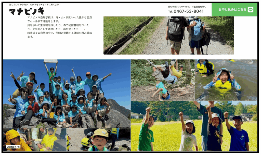 | 事業内容 | ⑴探究型学習プログラムの提供:子どもたちが自分の興味を追求し、深く学ぶためのワークショップやスクールを運営 ⑵自然体験活動:週末に自然とふれ合うワークショップを開催し、五感を活かした学びを促進 ⑶フリースクールの運営:子どもたちが自由研究型の学びを実践できる場を提供 ⑷相談支援:子どもや保護者向けの相談支援を実施し、学びの選択肢を広げる |