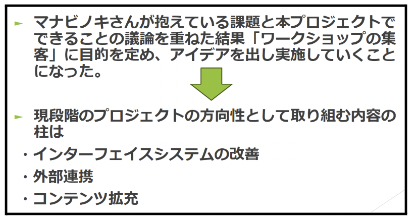 取り組む課題を大きく3つに分け、社会人メンバー、団体メンバーがそれぞれのテーマに別れて議論を重ねています。これは、プロジェクトのスタート段階で、社会人メンバーと団体メンバーが丁寧に対話を重ね、何について取り組むかを「いかにマナビノキの活動への想いを発信していくか」にフォーカスした結果、マナビノキの活動の軸となる「探求学習」の認知をいかに広げていくかが大きなテーマとなりました。インターフェース・システムの改善では、HPの改修方法の提案やLPの作成検討などを行っています。外部連携では、「自由研究コンテスト」の開催に向けて、外部機関をどのように巻き込むかを検討しています。コンテンツ拡充では、インスタ、youtube等での動画コンテンツの作成方法を検討しています。週1回のミーティングでは、これらの各テーマから進捗報告、意見交換を行うことで、全体の進捗をみんなで把握し、連携を取りながら進めています。テーマごとの日々の活動は、Slackを活用し、活発に議論や作業が進められています。社会人メンバー、団体メンバーともにこのプロジェクトを「楽しむ」を合言葉に、日々の活動に取り組んでいます。最終報告に向けて、プロジェクトを通じて、マナビノキにどのような変化を加えられるか楽しみです!