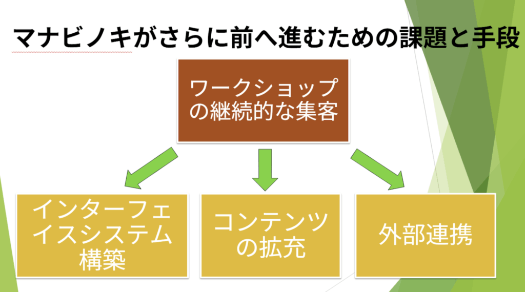 以前は、東京都内や鎌倉市外からもたくさん参加いただいていたのですが、最近は、減少傾向が続いています。いかに、探究型のワークショップの良さを知っていただき、参加していただき、マナビノタネを蒔くためのアイデアをみんなで考えていきます。