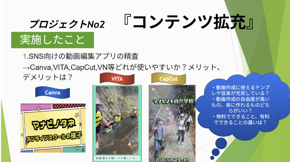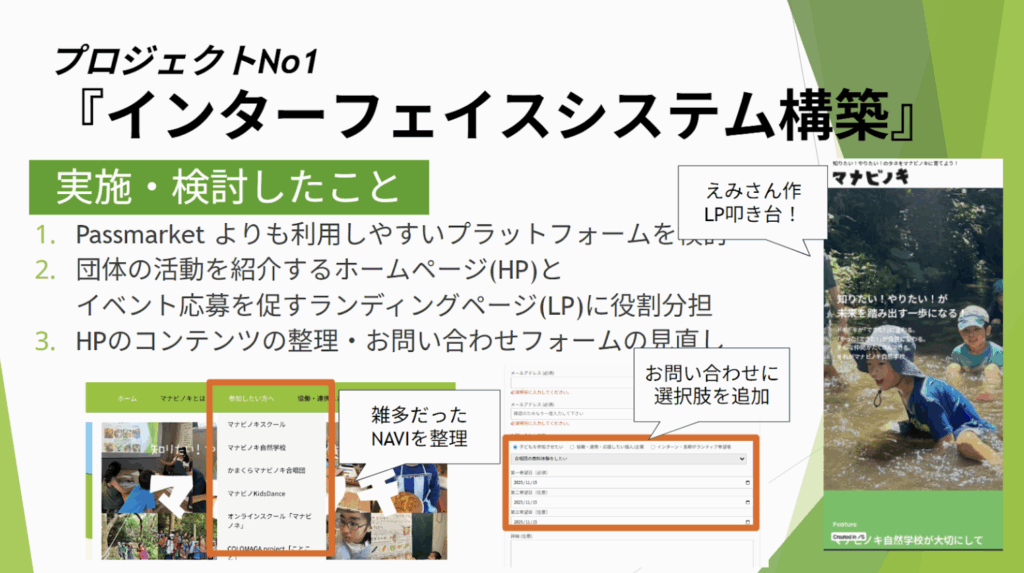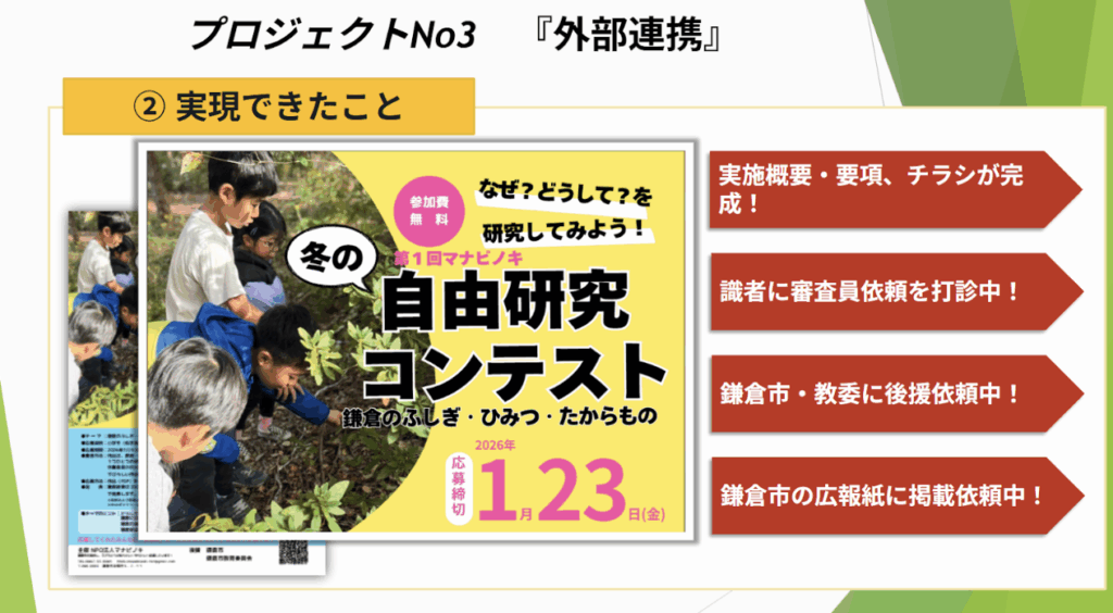 マナビノキの想いをどのように社会に継続的に発信していくかを考えていく中、ワークショップの継続的な集客がマナビノキの想いの共感者を増やしていくのではないかという結論の元、3つの課題に取り組みました。インターフェースシステム構築では、ワークショップの申込動線の一本化、HP・LPの役割分担、HP内コンテンツの整理を行いました。コンテンツ拡充では、SNS向け動画編集アプリの精査を行い、作成する動画の種類によって、使用するアプリを変えることで作成の効率化が図れることがわかりました。外部連携では、外部と連携を思考するためのコンテンツとして、「自由研究コンテスト」を作り、実際に外部(有識者、公的機関、地元企業など)をどのように巻き込みながらコンテンツを運用していくかにチャレンジしました。どの課題も、3か月で完結を意識しすぎずに、このプロジェクトが終了後もマナビノキの将来に繋がるもの取組みになるようみんなで試行錯誤しながら進めてきました。どの課題も3か月で完結には至っていませんが、方向性・大枠はまとまり、次に繋がる成果物をマナビノキに引き継ぐことが出来ました!