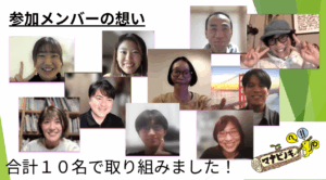 団体代表のプレゼンからすべてが始まったこのプロジェクトメンバー。団体への想いで繋がった9名(社会人5名、団体4名)のプロジェクトでした。毎回のMTGやSlackでのやり取りを見ていると、社会人メンバー、団体メンバー関係なく、マナビノキをもっと進化させたいという想いが日々、強くなっていくメンバーでした!このプロジェクトに参加したメンバー一人一人がお互いに良い刺激を受けながら、前に進んだ3か月間だったと感じています。一方で、MTGやSlack上で、雑談で盛り上がる時もあり、ホントに仲の良いチームになった3か月のプロジェクトでもありました!背景の異なるメンバーが想いで繋がり、チームとして成果を出すサポートプロジェクトを体現できたのではないかと感じています。3か月間、みなさん、本当にお疲れさまでした!そして、今後のゆる~い繋がりを大切に、このプロジェクトで蒔かれた「種」をみんなで、立派な「木」に育てていきましょう!(けんさん)