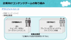 具体的な取り組みとしては、まず一つ目が「企業向けコンテンツ」の作成です。HIKIDASHIはこれまで行政や教育機関、保護者向けの講演を通じて実績を重ねてきました。今後も安定した活動基盤を維持するために、企業向けの活動の幅を広げたいと考え、企業向けコンテンツや営業資料を作ることとしました。企業ではプレコンセプションケア*やSDGsといった観点から従業員の健康やライフステージ支援に関する教育ニーズが高まっているため、社会人メンバーは企業で働いている自分自身の経験が活かし、企業に届くコンテンツを作りたいと考えています。