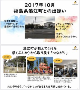 当初は「学生を巻き込んだイベントを企画しよう」「みんなが主体的に参加できるイベントとは何か」といった、ややアウトプットに焦点を絞った思考での議論が主でした。しかし、会を重ね、「なぜやるか」という本質的な問いを深める中で、「浪江町の人にとって祭りとは何か」「祭りをきっかけに人が集まり、共助の意識が芽生える」「強制されない防災や地域づくり」といった、団体様が最も大事にしたい理念に目が向くようになりました。