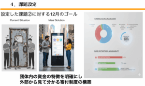 中間報告会までcotohanaの現状、4人の運営メンバーの日常をとても丁寧にヒアリングし、見えてきた問題点の整理を通じて課題設定を行いました。この素敵な活動をより多くの人に知ってほしい、復興財源に頼らない仕組みを構築したい、そんな想いを込めて、cotohanaが実現したい中長期の未来を意識し、課題を3つ設定しました。課題別にcotohanaメンバーとも協働する3チームに分かれて、アウトプットを出していくことに集中することにしました。