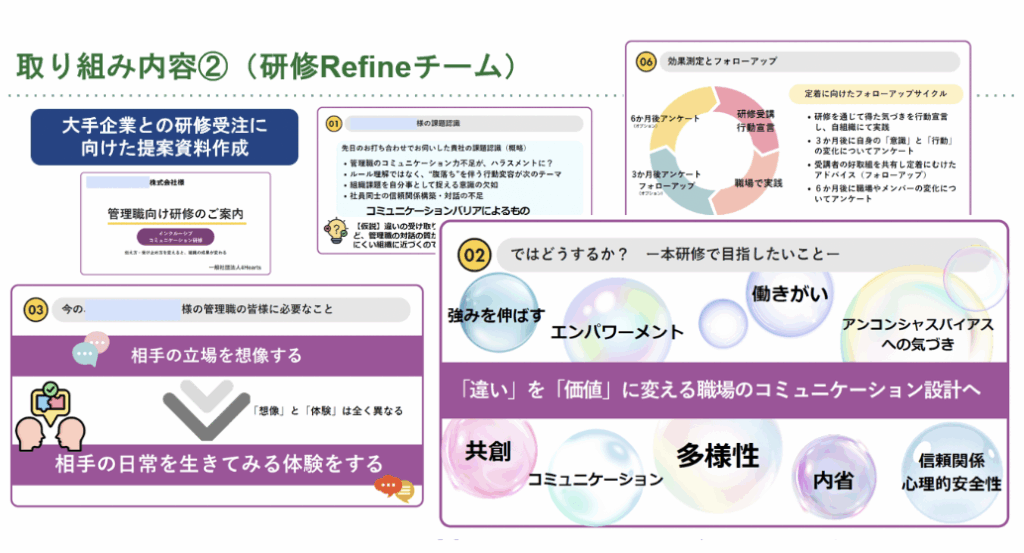 現時点では、研修の価値整理、目的とゴールの明確化、企業ニーズへの翻訳、営業導線の設計といった論点が可視化され、最終報告に向けた具体的な検討フェーズに入っています。