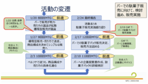 中間発表後、数回のミーティングを行う中で、団体と社会人、それぞれが思うことや考えをざっくばらんに話す機会を設けることができました。これまでは、お互いにモヤモヤ感を持っている中で進めてきたところがありましたが、後半は気になることや違和感をしっかりと伝えられる関係性を構築できていると感じます。目標設定やそれに対するアクションはまだ粗さがあり、決してスムーズとはいえませんが、残り少ない時間を使って協力しながら進めていこうとモチベーションは上がりつつあります。